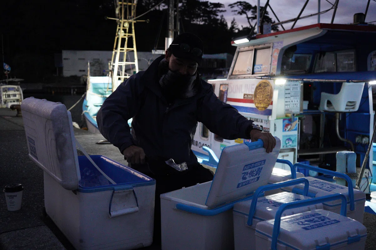 港で魚を選別する様子。山田船長もアドバイスしてくれています。