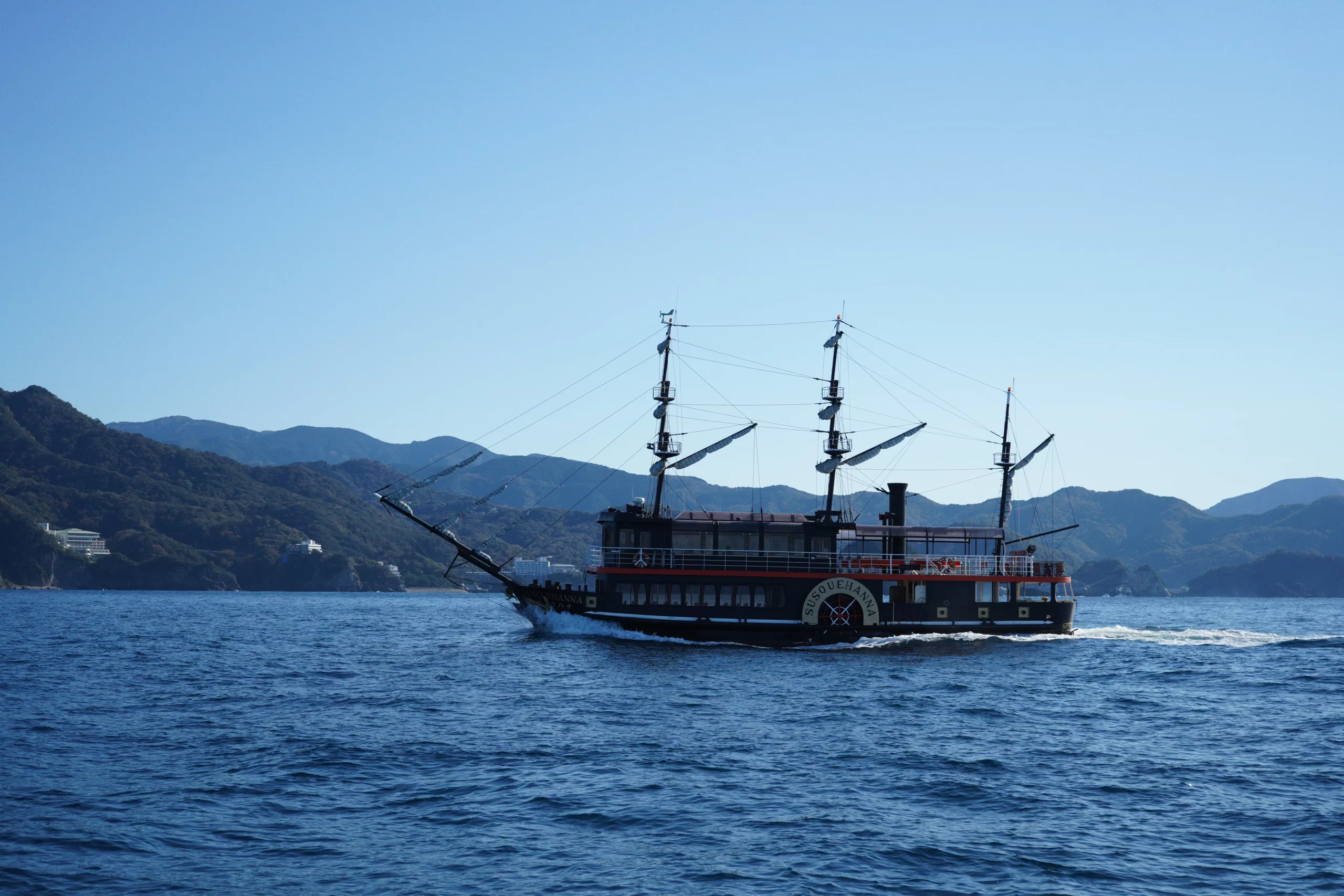 伊豆・下田港内を巡る遊覧船・黒船「サスケハナ」が西伊豆の堂ヶ島沖に登場!