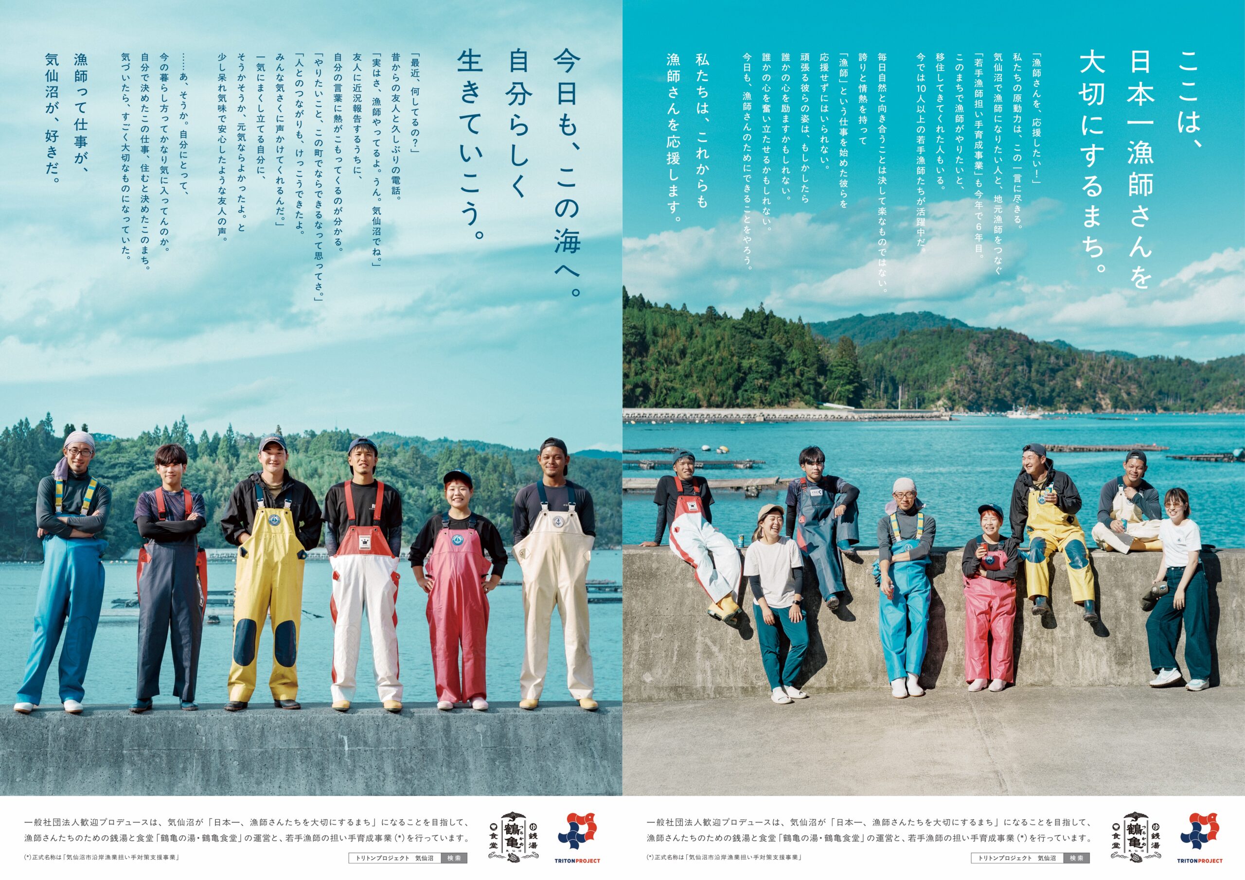 気仙沼の各所に掲示されている、色とりどりのカッパに身を包み堤防の上にすっくと立つ漁師のポスター。実は、気仙沼の漁師という共通点はあるものの、年齢も出身地も養殖漁業や定置網漁など漁法もさまざま。けれど、互いのリスペクトと共に程良い距離感は爽やかで微笑ましくもあります。