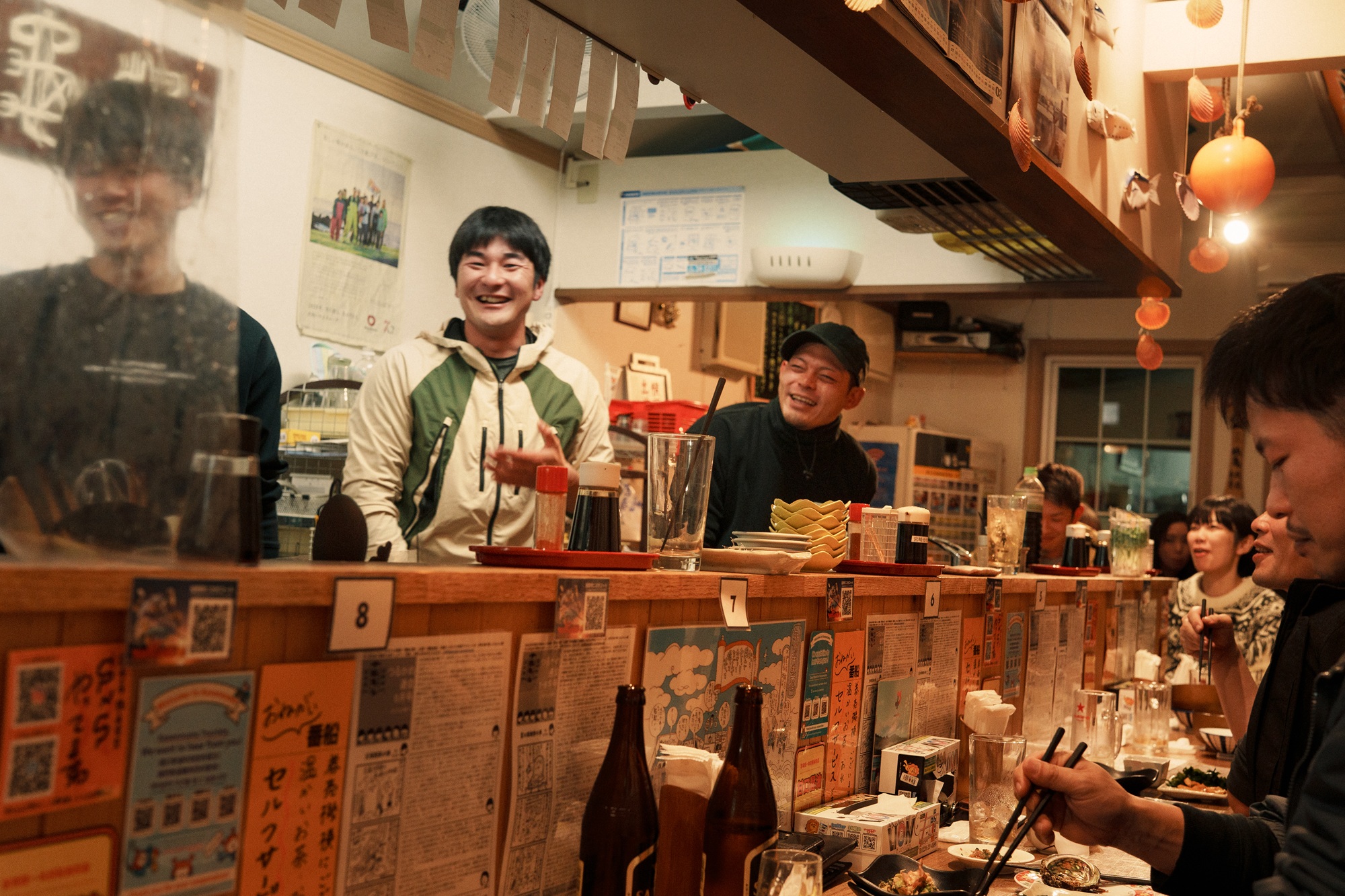 「漁師居酒屋」も今では地元だけでなく遠方からの常連客も増え、会話も弾みます。お客さんも普段はあまり知らない漁師さんの話に興味津々です。若手漁師同士の楽しい会話と美味しい海産物。気仙沼の若手漁師は、立派な水産業のアンバサダーも担ってくれているようです。