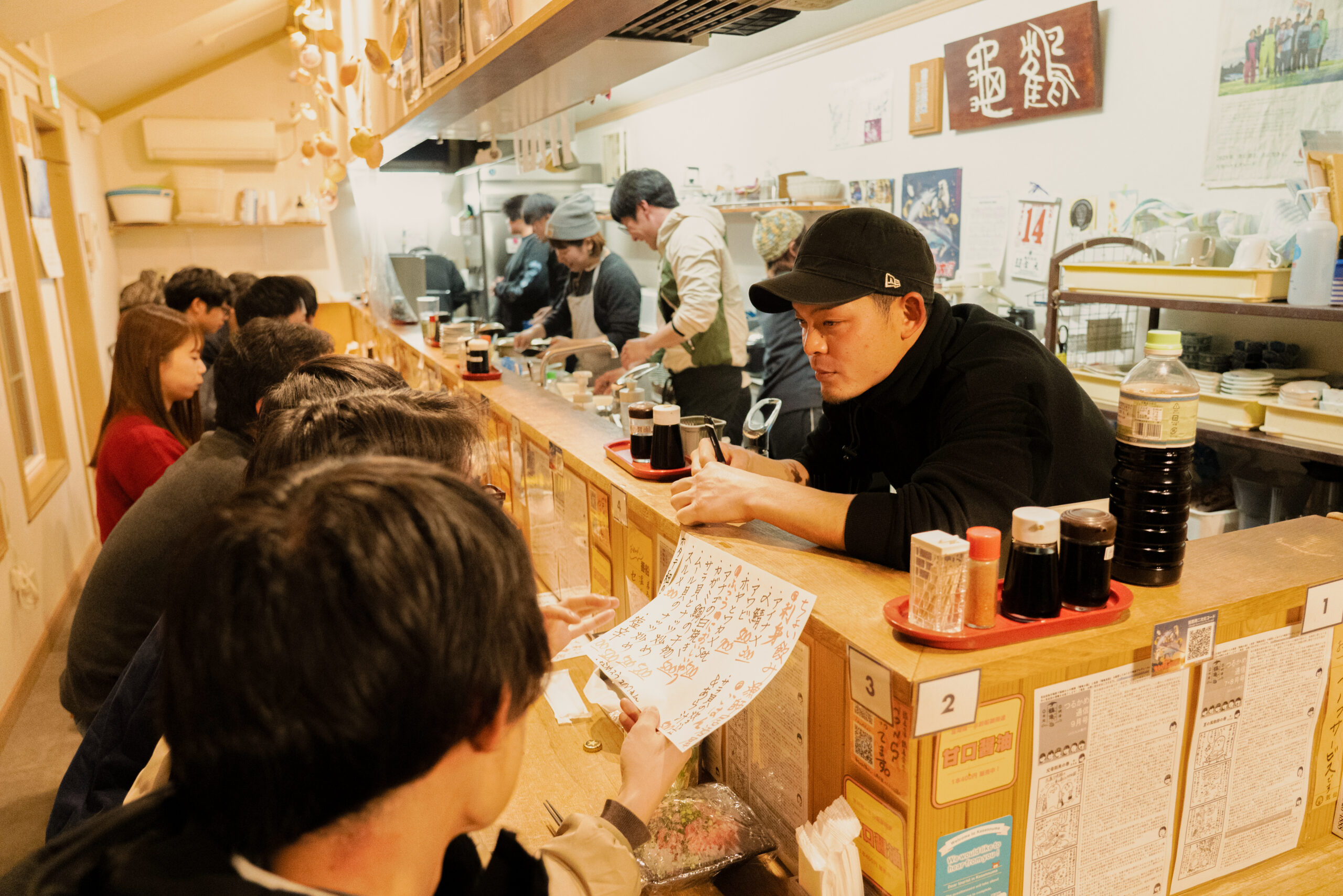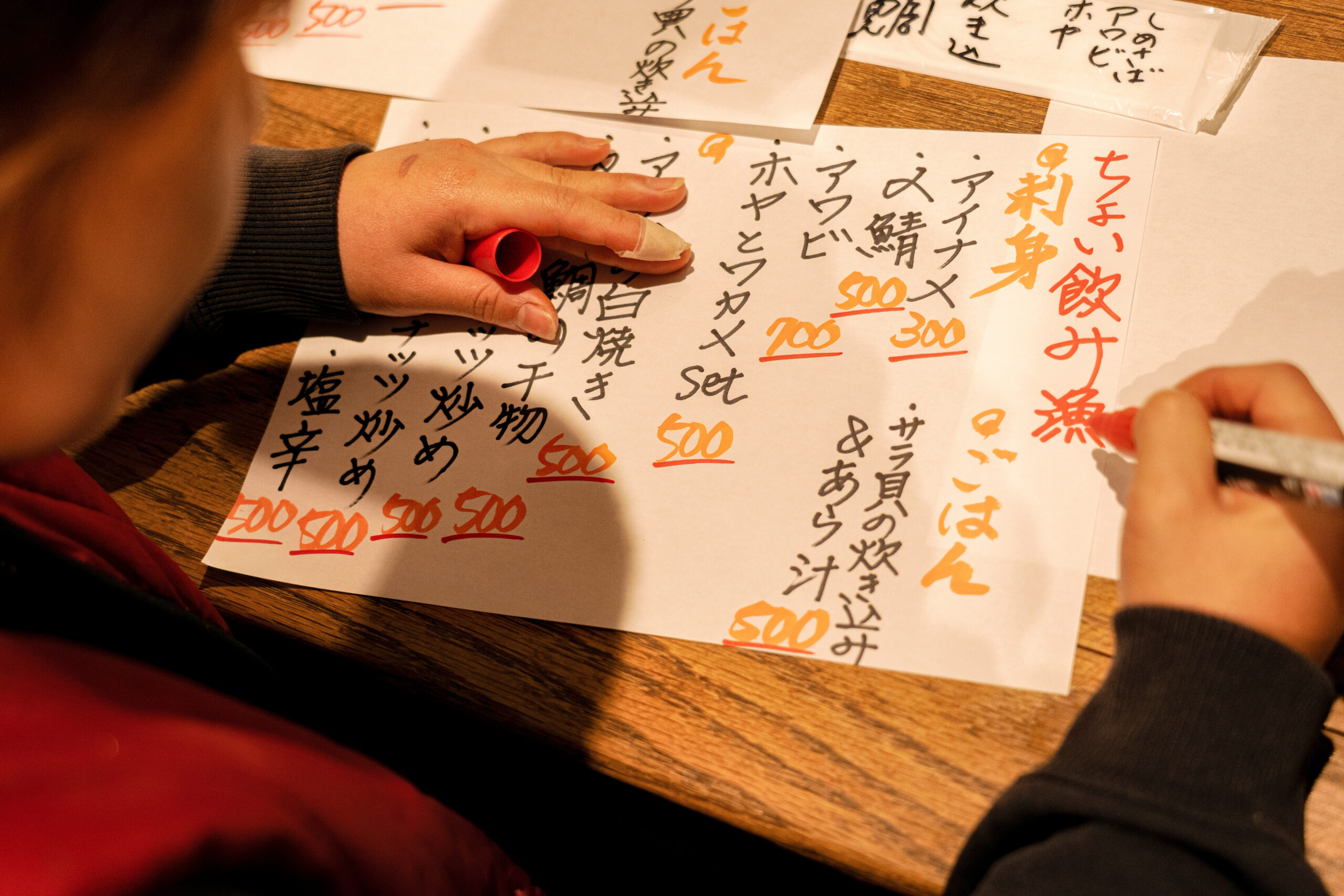 12月某日、土曜日。気仙沼の山の端が茜色に染まり、やがてとっぷりと夜の帳が下りる頃、気仙沼の魚市場前、みしおね横丁の鶴亀食堂に、気仙沼の若手漁師が集まり始めました。自分たちで獲った、育てた海産物を持ち寄り、お客さまに提供する、いわゆる「漁師居酒屋」が間も無く開店します。