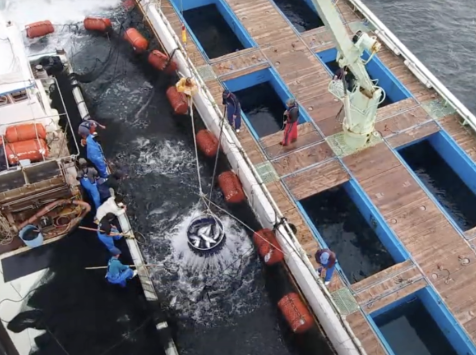 出荷作業はメンバーみんなで協力しながら、丁寧に素早く生け簀の魚を運搬船に積み込みます。