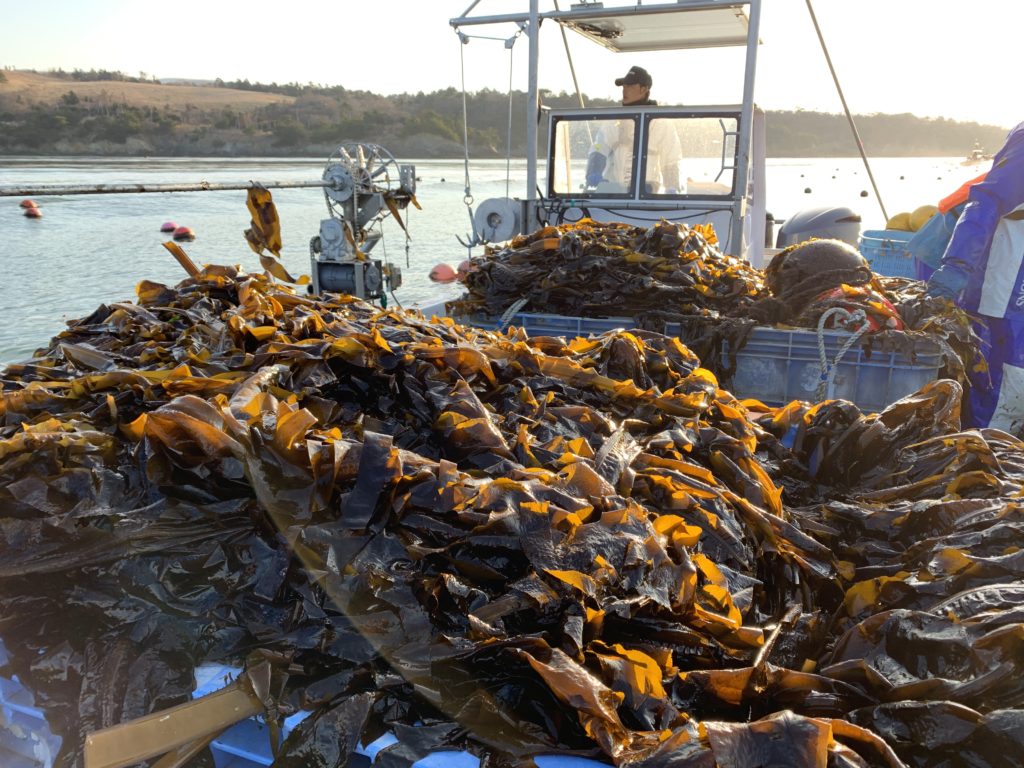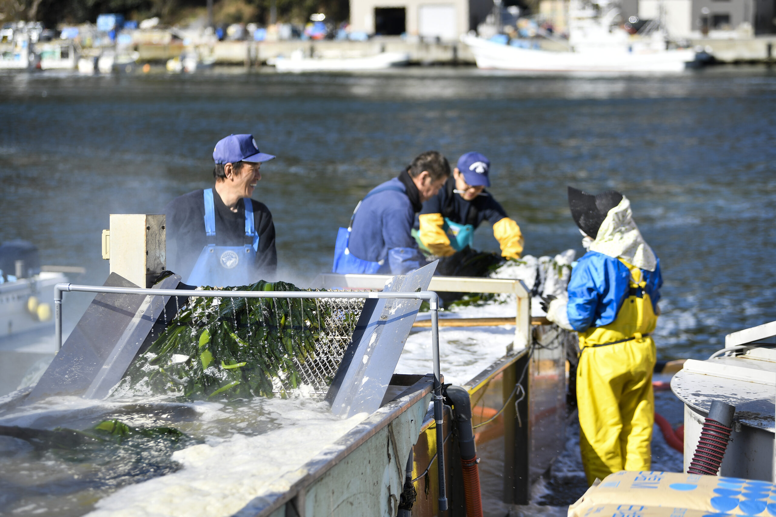 海に出るのが5時ごろで、7時頃に陸に戻って陸作業を行います。収穫からボイル、塩蔵までの作業を手がけているので、たくさんのスタッフが手伝いにきます。ワカメ時期には、10人以上のアルバイトの方が働きに来てくれて、それだけ人手がかかる大変な作業ではありますが、浜がとても賑やかになる時期でもあり楽しいですね。活気で溢れています。