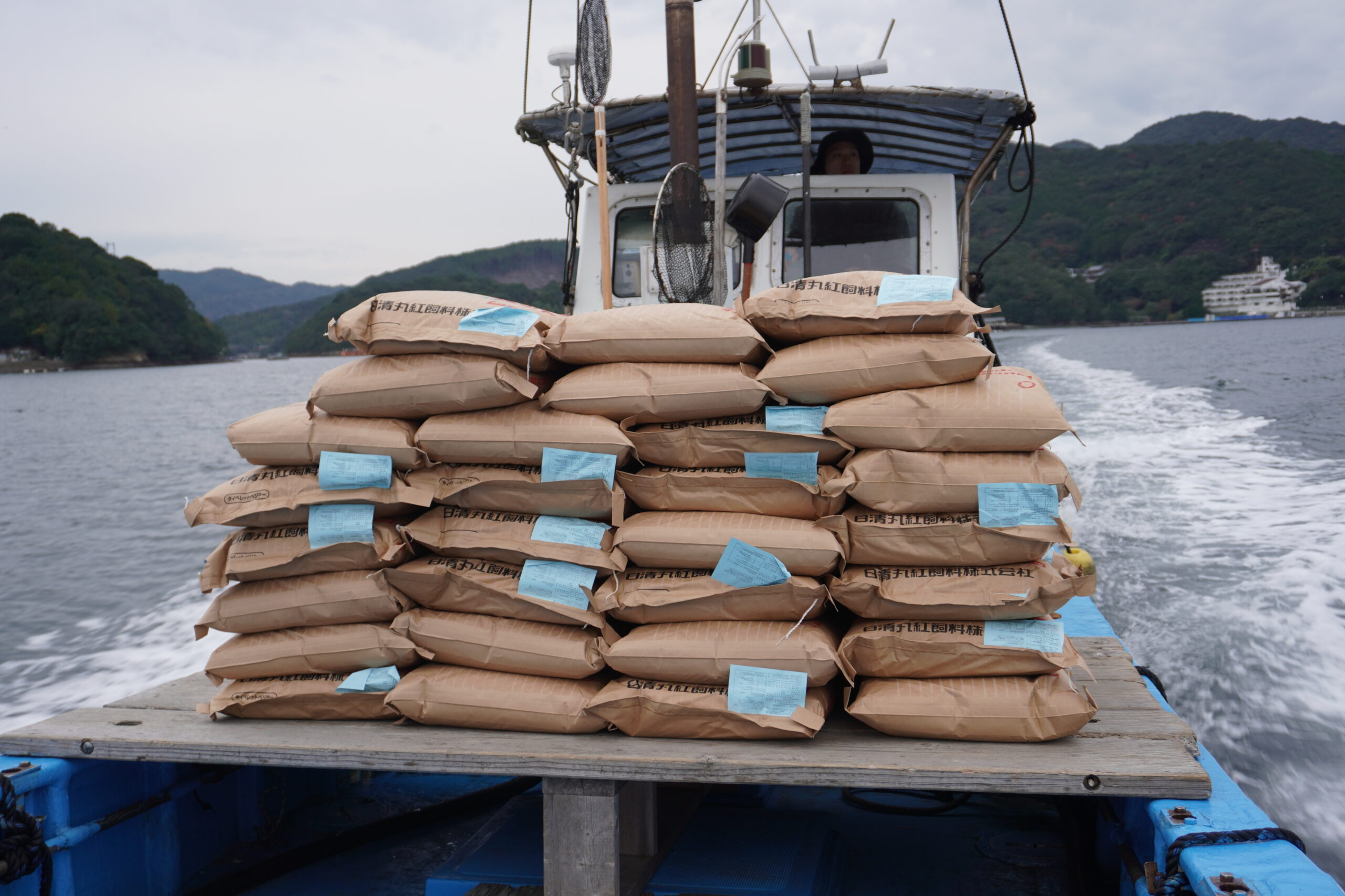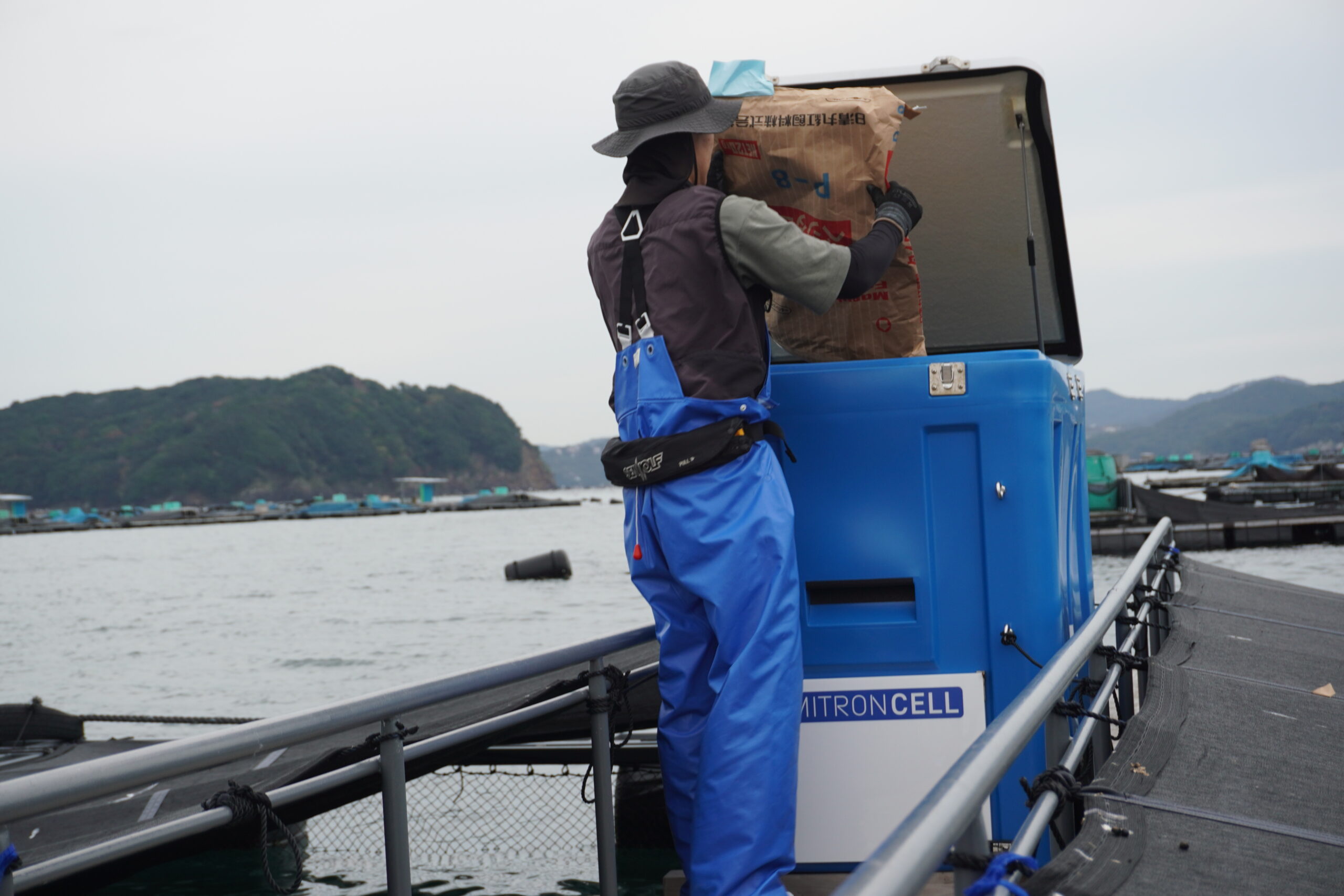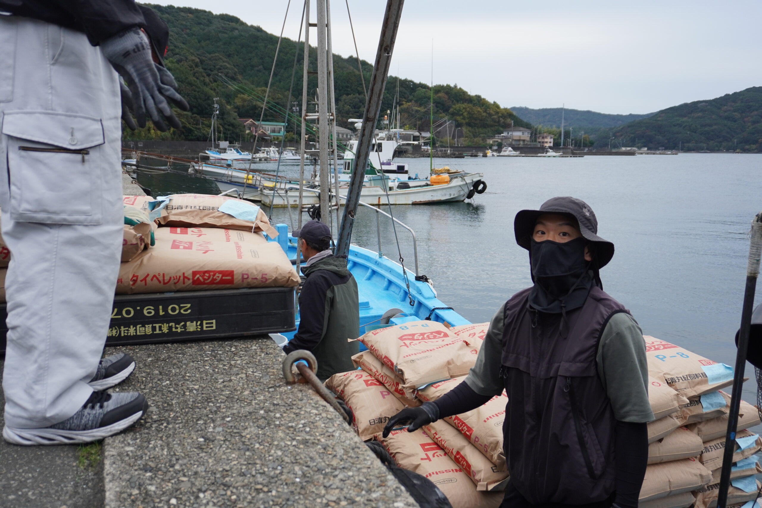 朝、漁協の方の協力を得ながら、船に1日分の餌を積み込みます。