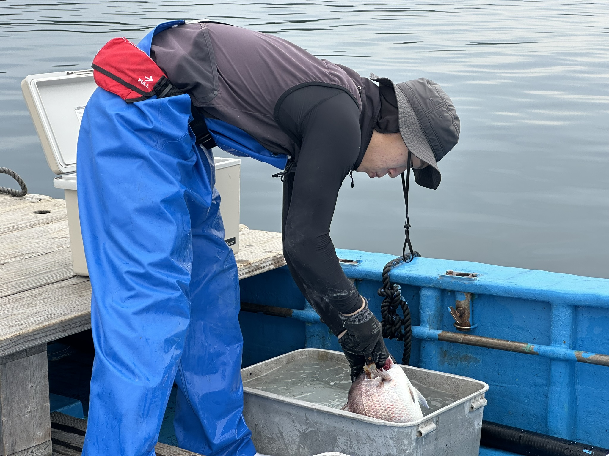 出荷がある日は、生簀から鯛を水揚げします。水揚げ後、船上で手際よく締めて血抜きをし、最高の状態で出荷するための準備をします。