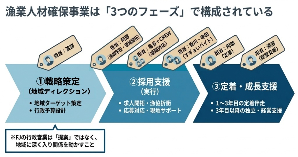 FJの漁業人材確保事業は、大きく3つのフェーズで構成されています。