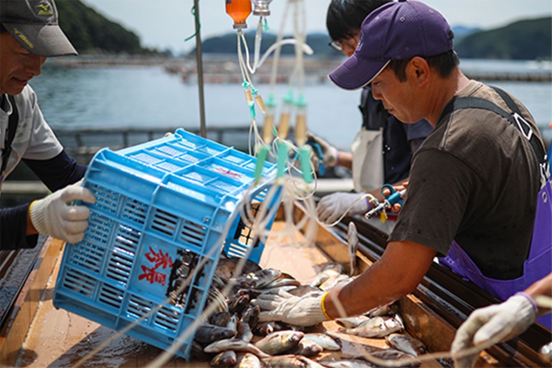船に乗って海上の生簀へ向かい、養殖業者さんと一緒に作業に入ります。